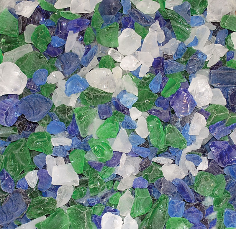 Also known as recycled glass, tumbled glass, and glass mulch, these pebbles have been tumbled to remove any sharp edges.