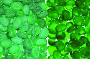 Also known as recycled glass, tumbled glass, and glass mulch, these pebbles have are smooth and tumbled. Sold dry, they darken and become even more striking when wet.