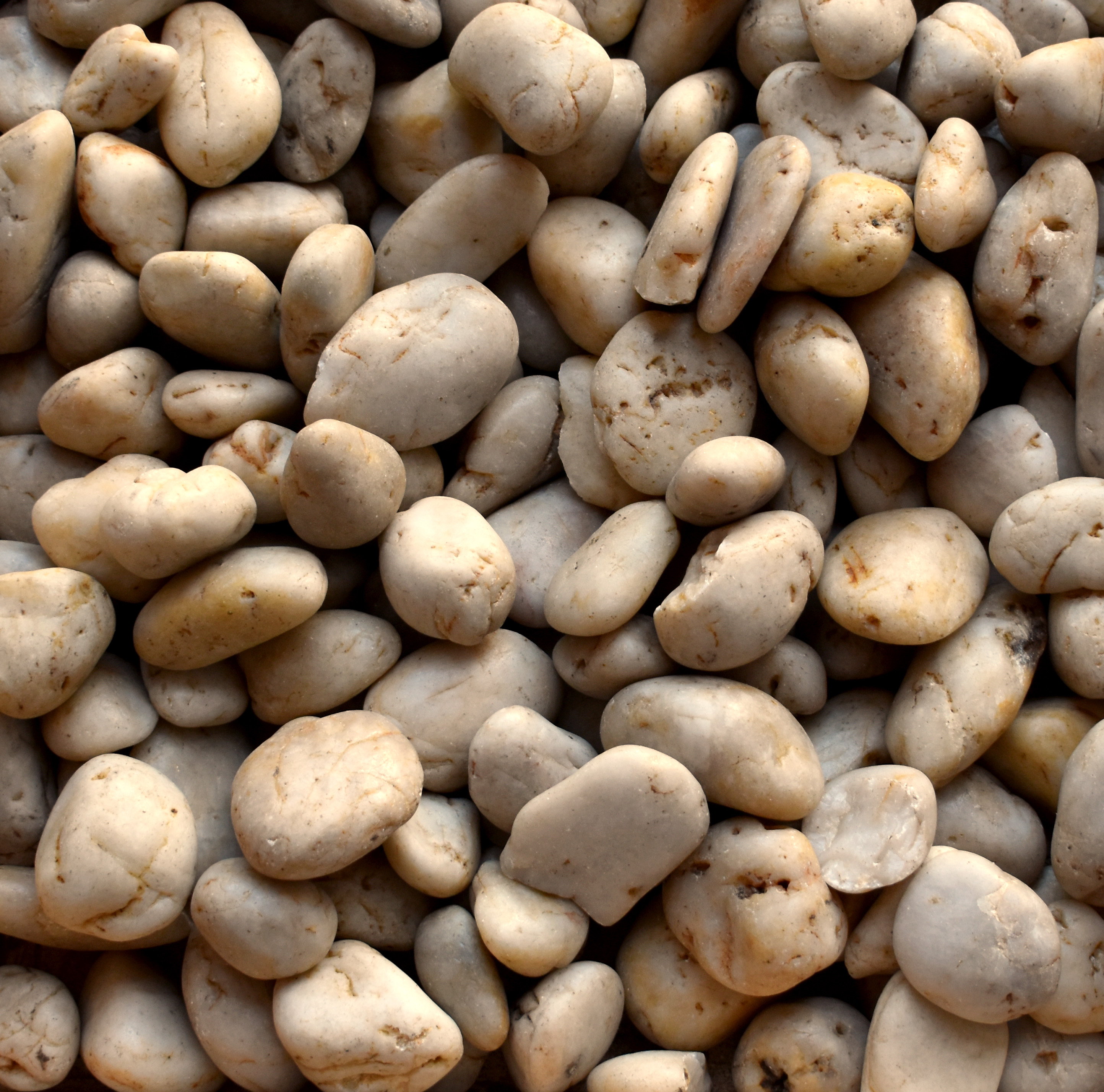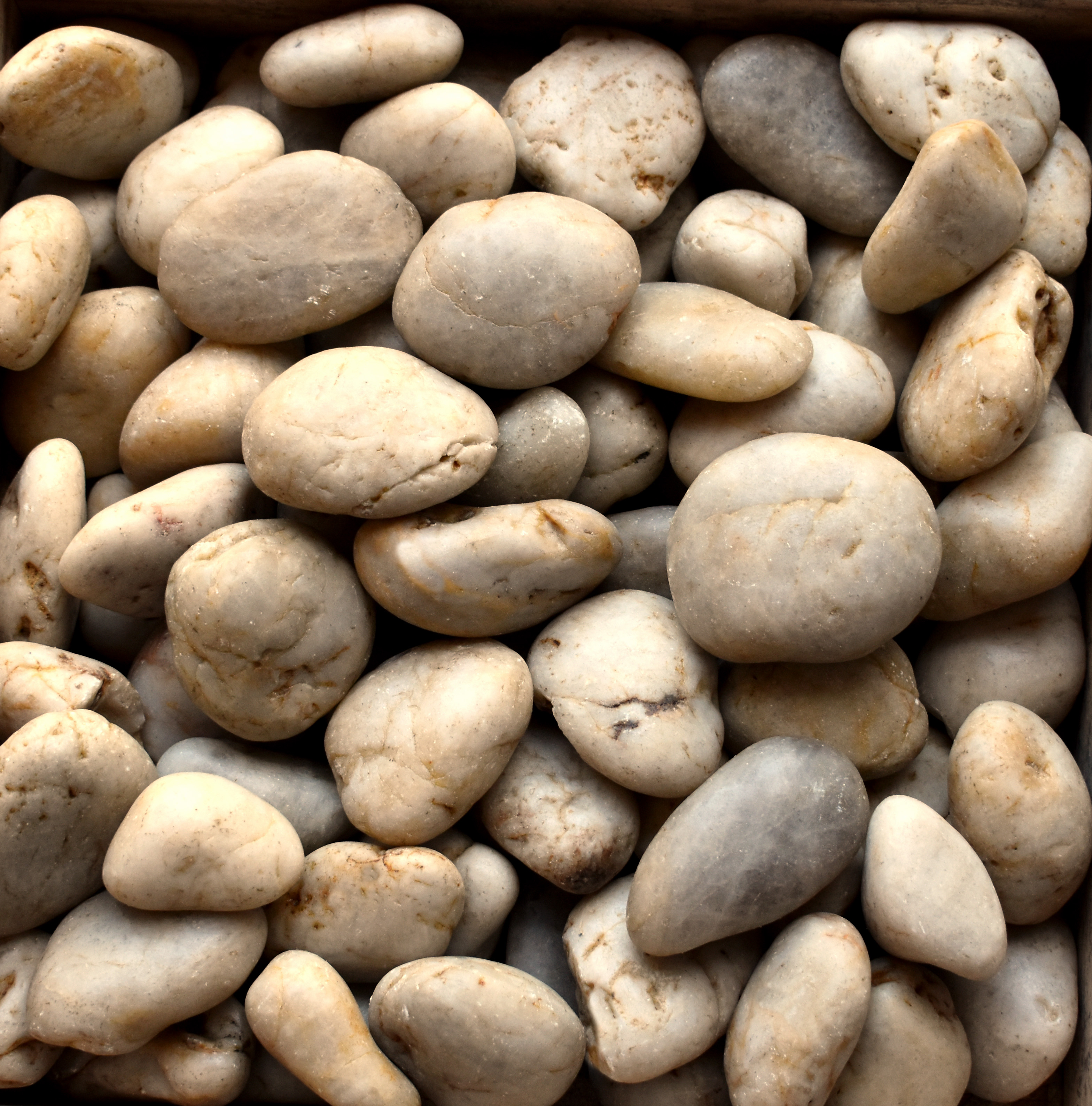 Clean and refined looking, our polished white pebbles are perfect for achieving a light and airy feel. Marble whites, shades of gray, and spots of light yellow provide these pebbles with subtle yet distinctive characteristics. Sometimes called polished Mexican Beach pebble and polished cobble, our polished white pebbles are classy and elegant.