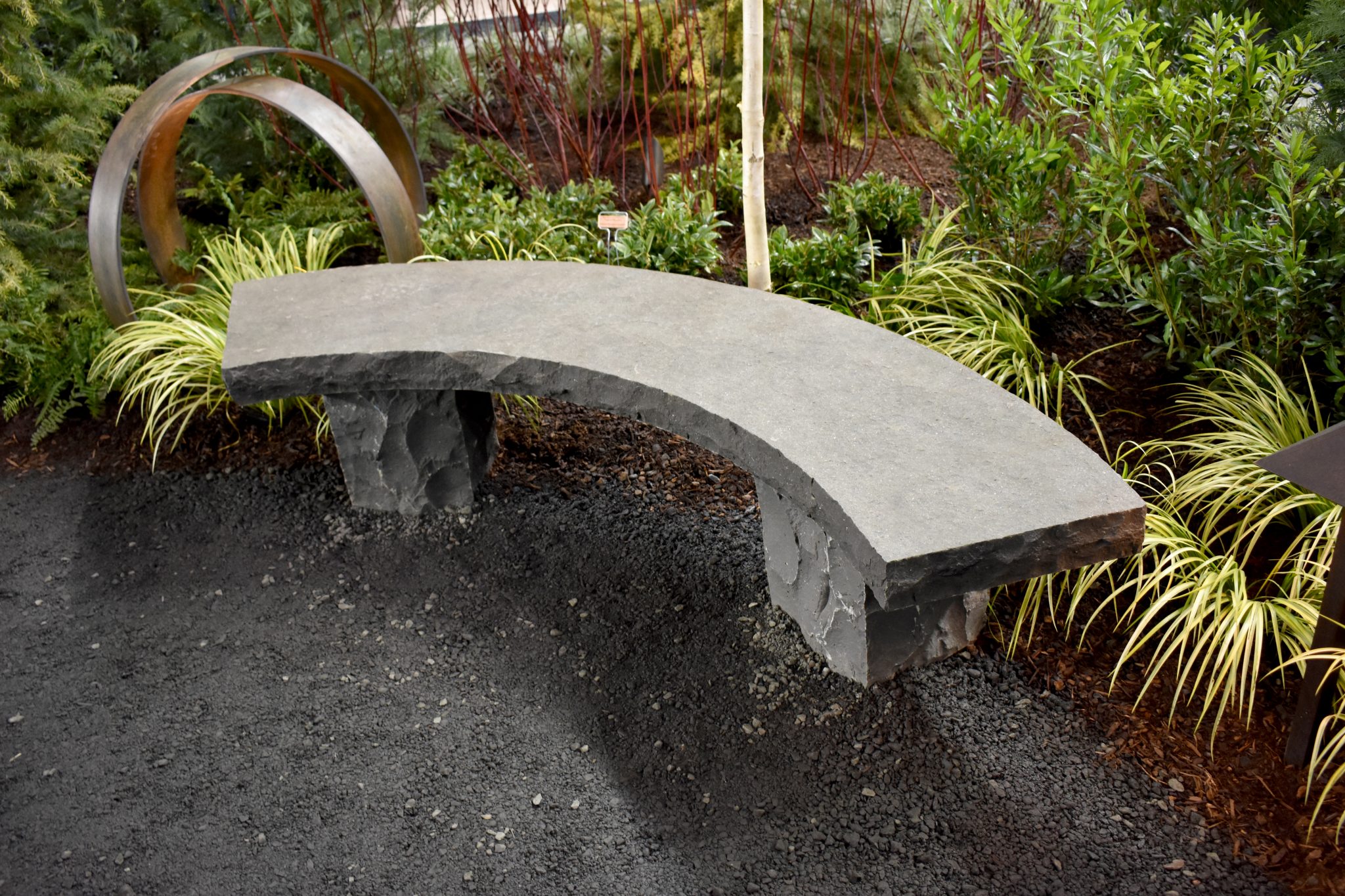 With all of the natural Basalt crust removed from the legs and bench top, our curved basalt benches are a rich, smoky charcoal color.