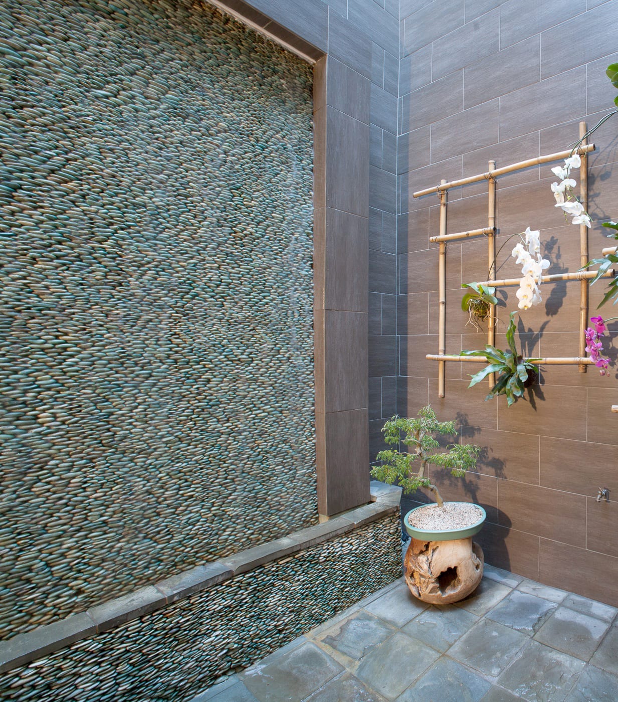 In order to achieve good adhesive bond, be sure to identify any surface contaminants that may be present and remove. The standing pebbles are approximately 7lbs./sq.ft. installed, and in some instances may require structural angle support. An engineer’s opinion may be needed for weight bearing walls. Wet areas need special attention and require appropriate substrates, e.g. concrete, cement boards (compressed sheet) and treated plywood. The use of reinforced waterproof membranes is recommended.